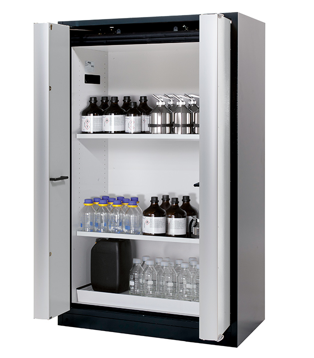 Korpusfarbe Anthrazitgrau (RAL 7016), mit Falttüren in Lichtgrau (RAL 7035), Inneneinrichtung mit 2 x Fachboden, 1 x Lochblecheinsatz, 1 x Bodenauffangwanne (Stahlblech pulverbeschichtet)