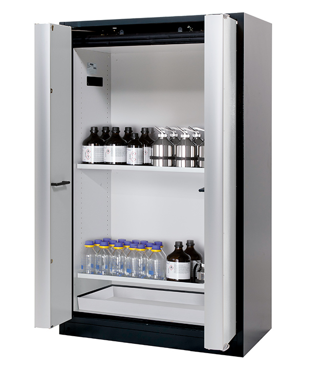 Korpusfarbe Anthrazitgrau (RAL 7016), mit Falttüren in Lichtgrau (RAL 7035), Inneneinrichtung mit 2 x Fachboden, 1 x Bodenauffangwanne (Stahlblech pulverbeschichtet)