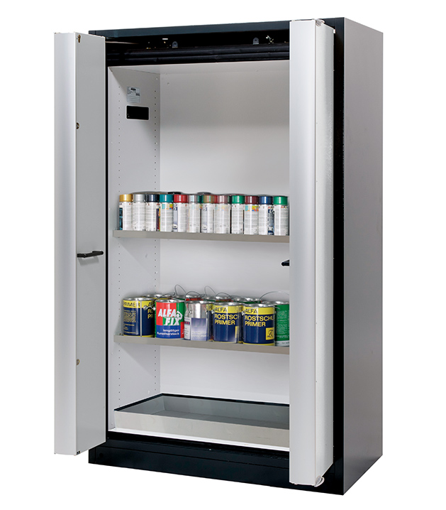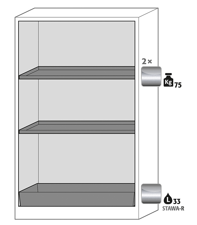 Korpusfarbe Anthrazitgrau (RAL 7016), mit Falttüren in Lichtgrau (RAL 7035), Inneneinrichtung mit 2 x Fachboden (Edelstahl 1.4301), 1 x Bodenauffangwanne (Edelstahl 1.4016)