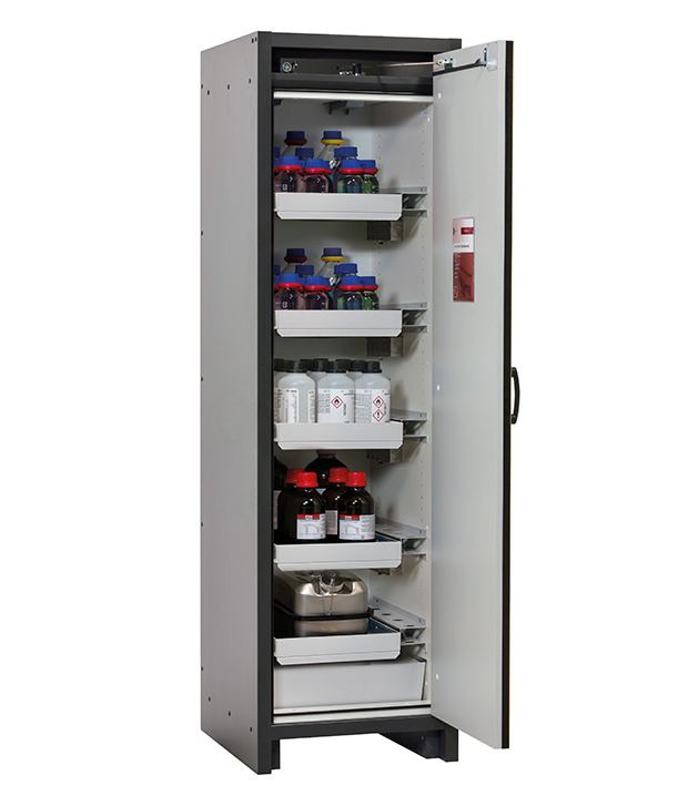 Korpusfarbe Anthrazitgrau, mit Flügeltür in Sicherheitsgelb (RAL 1004), Inneneinrichtung mit 4 x Auszugswanne, 1 x Auszugswanne Entsorgung, 1 x Bodenauffangwanne (Stahlblech pulverbeschichtet)