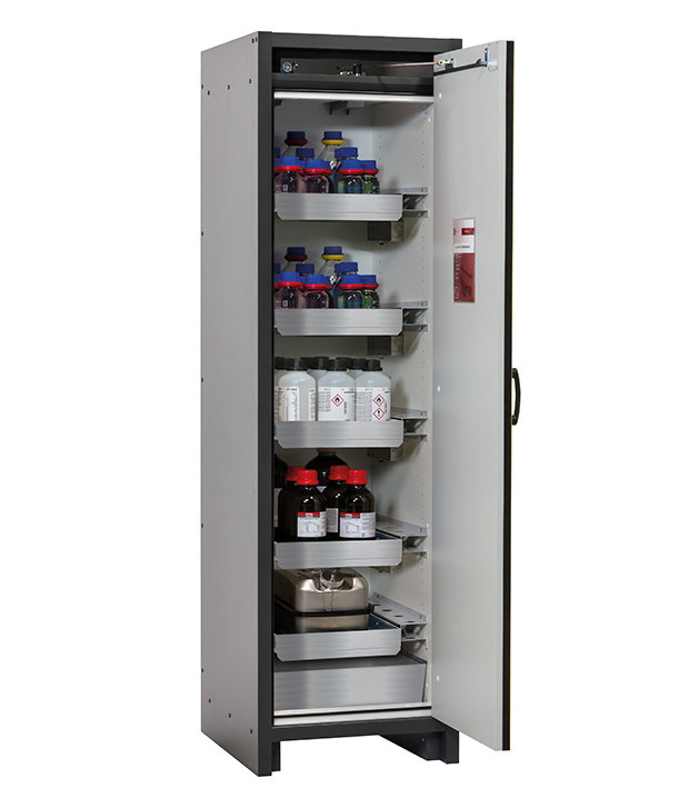 Korpusfarbe Anthrazitgrau, mit Flügeltür in Sicherheitsgelb (RAL 1004), Inneneinrichtung mit 4 x Auszugswanne, 1 x Auszugswanne Entsorgung (Edelstahl 1.4301), 1 x Bodenauffangwanne (Edelstahl 1.4016)