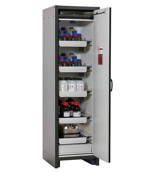 Korpusfarbe Anthrazitgrau, mit Flügeltür in asecos Silber, Inneneinrichtung mit 4 x Auszugswanne, 1 x Auszugswanne Entsorgung, 1 x Bodenauffangwanne (Stahlblech pulverbeschichtet)