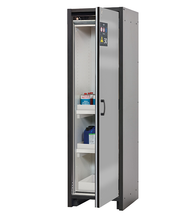 Korpusfarbe Anthrazitgrau, mit Flügeltür in asecos Silber, Inneneinrichtung mit 2 x Wannenboden, 1 x Bodenauffangwanne (PP)
