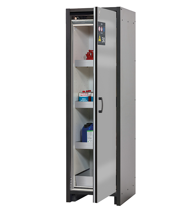 Korpusfarbe Anthrazitgrau, mit Flügeltür in asecos Silber, Inneneinrichtung mit 3 x Wannenboden (Edelstahl 1.4301), 1 x Bodenauffangwanne (Edelstahl 1.4016)