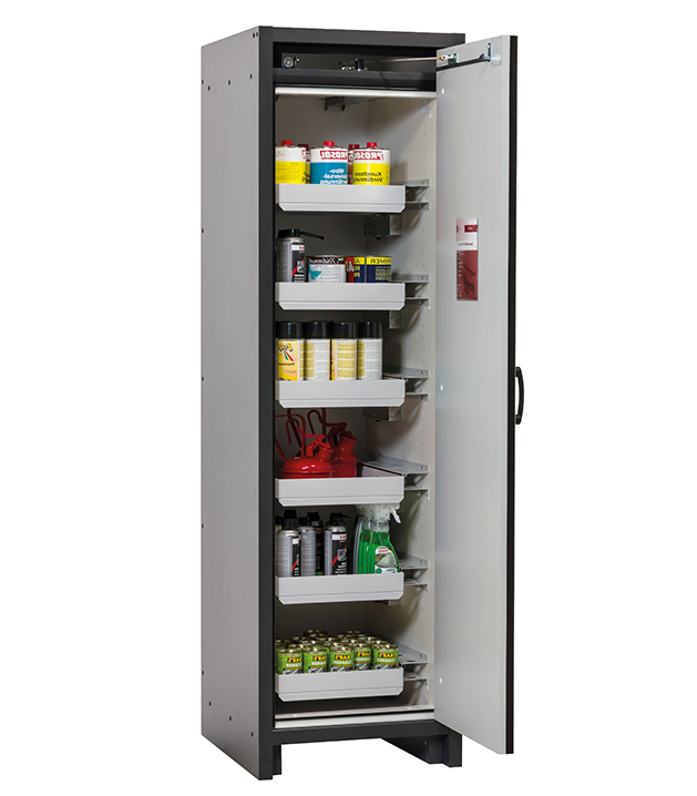 Korpusfarbe Anthrazitgrau, mit Flügeltür in asecos Silber, Inneneinrichtung mit 6 x Auszugswanne (Stahlblech pulverbeschichtet)