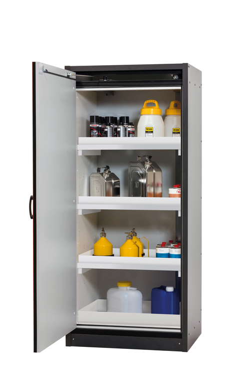 Bitte beachten Sie die jeweils gültigen, nationalen Regeln und Vorschriften zur Lagerung von Gefahrstoffen bei der Konfiguration Ihres Produktes. Sollten Sie unsicher sein, helfen Ihnen die asecos Experten gerne weiter.