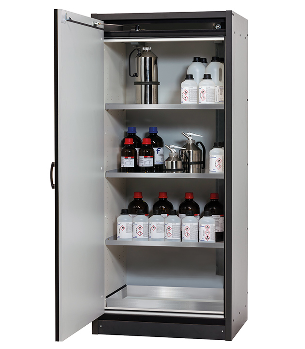 Korpusfarbe Anthrazitgrau, mit Flügeltür in asecos Silber, Inneneinrichtung mit 3 x Fachboden, 1 x Bodenauffangwanne (Edelstahl 1.4301)