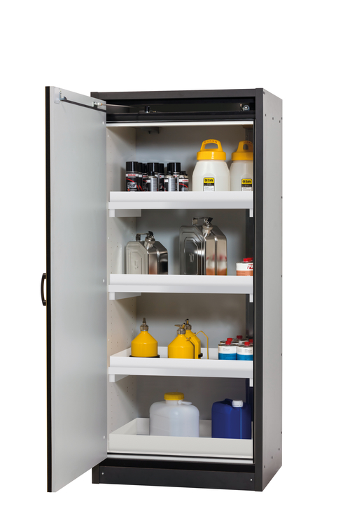 Korpusfarbe Anthrazitgrau, mit Flügeltür in Reinweiß (RAL 9010), Inneneinrichtung mit 3 x Wannenboden, 1 x Bodenauffangwanne (PP)