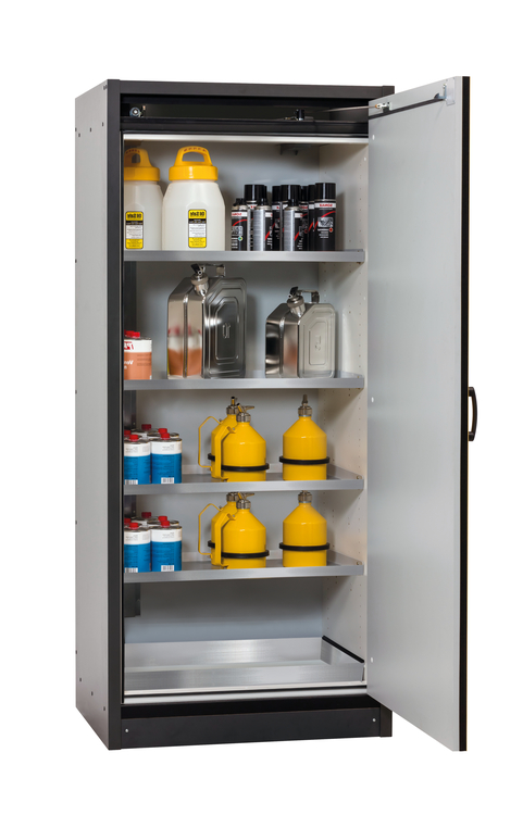 Korpusfarbe Anthrazitgrau, mit Flügeltür in Sicherheitsgelb (RAL 1004), Inneneinrichtung mit 4 x Fachboden, 1 x Bodenauffangwanne (Edelstahl 1.4301)