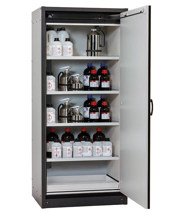 Korpusfarbe Anthrazitgrau, mit Flügeltür in Sicherheitsgelb (RAL 1004), Inneneinrichtung mit 4 x Fachboden, 1 x Bodenauffangwanne (Stahlblech pulverbeschichtet)