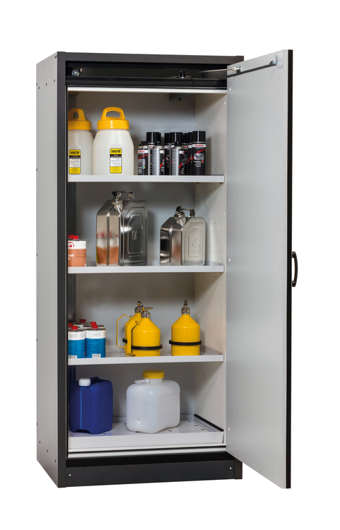 Korpusfarbe Anthrazitgrau, mit Flügeltür in Lichtgrau (RAL 7035), Inneneinrichtung mit 3 x Fachboden, 1 x Lochblecheinsatz, 1 x Bodenauffangwanne (Stahlblech pulverbeschichtet)