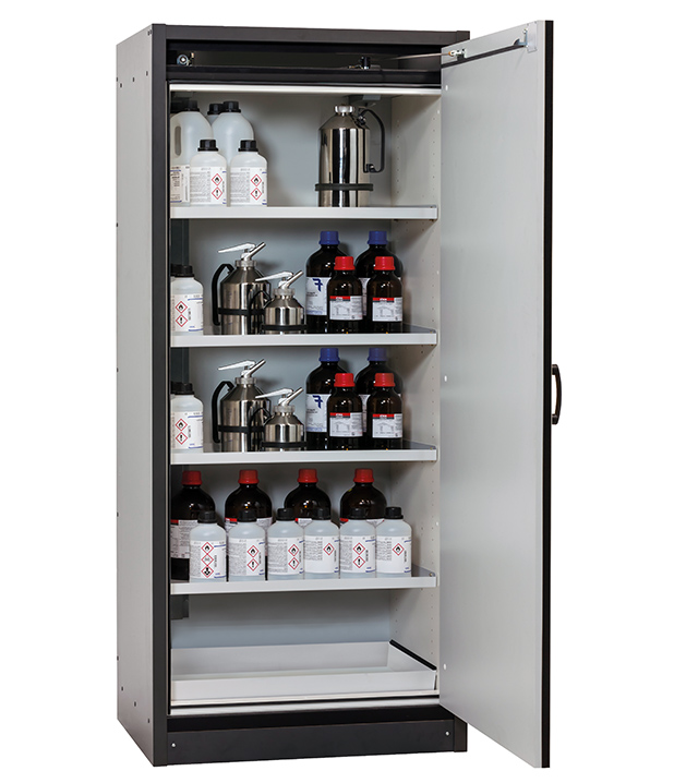 Korpusfarbe Anthrazitgrau, mit Flügeltür in Lichtgrau (RAL 7035), Inneneinrichtung mit 4 x Fachboden, 1 x Bodenauffangwanne (Stahlblech pulverbeschichtet)