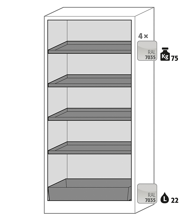 Korpusfarbe Anthrazitgrau, mit Flügeltür in Enzianblau (RAL 5010), Inneneinrichtung mit 4 x Fachboden, 1 x Bodenauffangwanne (Stahlblech pulverbeschichtet)