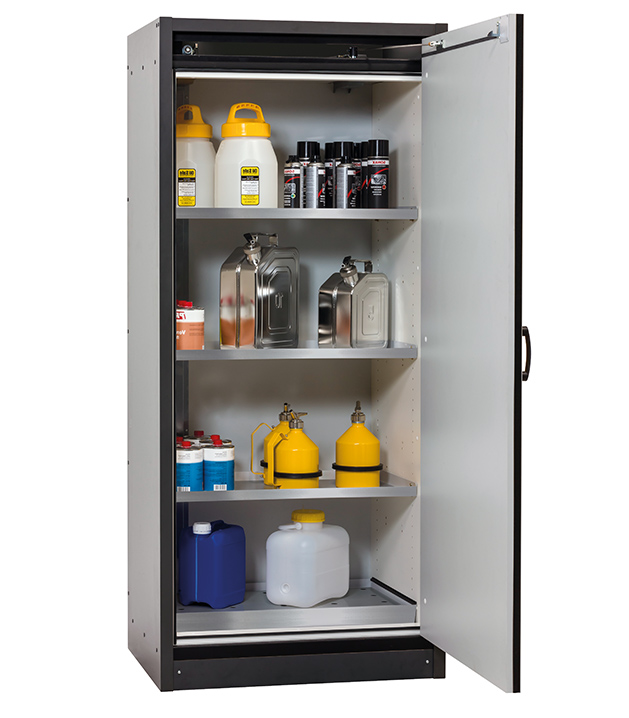 Korpusfarbe Anthrazitgrau, mit Flügeltür in asecos Silber, Inneneinrichtung mit 3 x Fachboden (Edelstahl 1.4301), 1 x Lochblecheinsatz (Edelstahl 1.4016), 1 x Bodenauffangwanne (Edelstahl 1.4301)