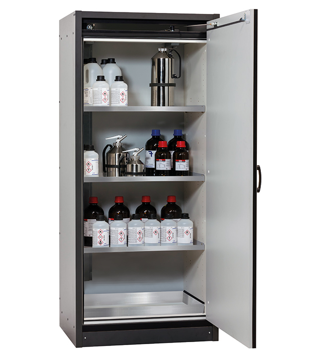 Korpusfarbe Anthrazitgrau, mit Flügeltür in asecos Silber, Inneneinrichtung mit 3 x Fachboden, 1 x Bodenauffangwanne (Edelstahl 1.4301)