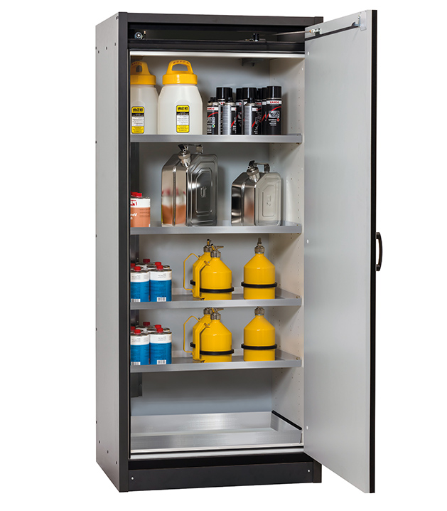 Korpusfarbe Anthrazitgrau, mit Flügeltür in asecos Silber, Inneneinrichtung mit 4 x Fachboden, 1 x Bodenauffangwanne (Edelstahl 1.4301)