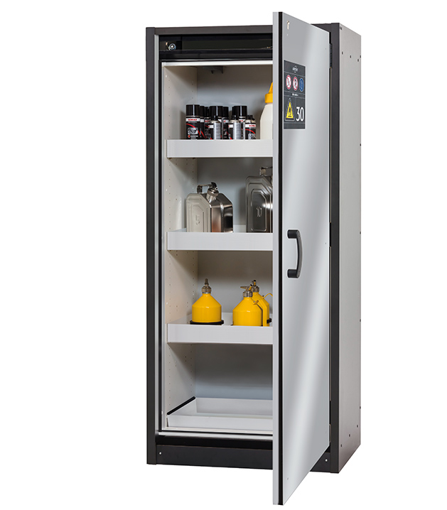 Korpusfarbe Anthrazitgrau, mit Flügeltür in asecos Silber, Inneneinrichtung mit 3 x Wannenboden, 1 x Bodenauffangwanne (Stahlblech pulverbeschichtet)
