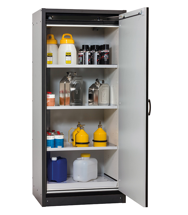 Korpusfarbe Anthrazitgrau, mit Flügeltür in Reinweiß (RAL 9010), Inneneinrichtung mit 3 x Fachboden, 1 x Lochblecheinsatz, 1 x Bodenauffangwanne (Stahlblech pulverbeschichtet)
