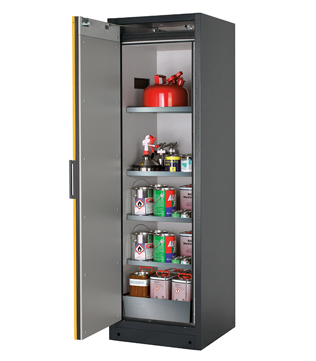 Korpusfarbe Anthrazitgrau (RAL 7016), mit Flügeltür in Sicherheitsgelb (RAL 1004), Inneneinrichtung mit 4 x Fachboden (Edelstahl 1.4301), 1 x Lochblecheinsatz, 1 x Bodenauffangwanne (Edelstahl 1.4016)