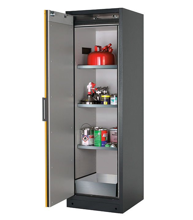 Korpusfarbe Anthrazitgrau (RAL 7016), mit Flügeltür in Sicherheitsgelb (RAL 1004), Inneneinrichtung mit 3 x Fachboden (Edelstahl 1.4301), 1 x Bodenauffangwanne (Edelstahl 1.4016)