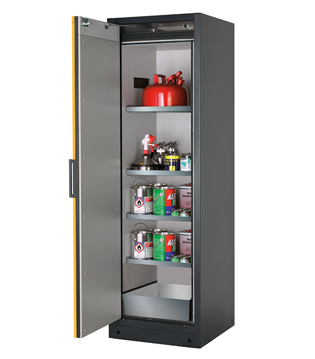 Korpusfarbe Anthrazitgrau (RAL 7016), mit Flügeltür in Sicherheitsgelb (RAL 1004), Inneneinrichtung mit 4 x Fachboden (Edelstahl 1.4301), 1 x Bodenauffangwanne (Edelstahl 1.4016)