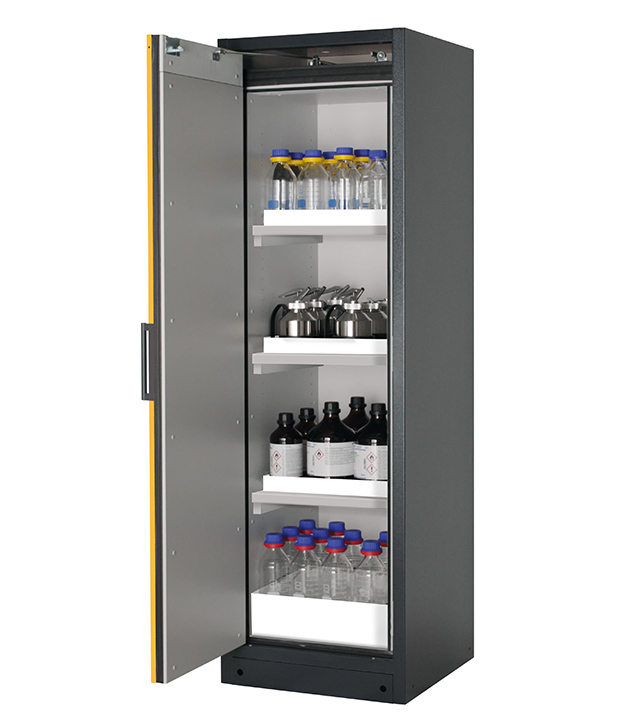 Korpusfarbe Anthrazitgrau (RAL 7016), mit Flügeltür in Sicherheitsgelb (RAL 1004), Inneneinrichtung mit 3 x Wannenboden, 1 x Bodenauffangwanne (PP)