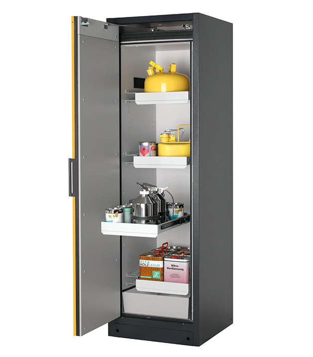 Korpusfarbe Anthrazitgrau (RAL 7016), mit Flügeltür in Sicherheitsgelb (RAL 1004), Inneneinrichtung mit 3 x Auszugswanne, 1 x Auszugswanne Entsorgung, 1 x Bodenauffangwanne (Stahlblech pulverbeschichtet)