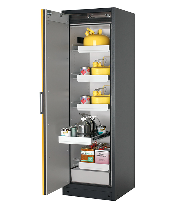 Korpusfarbe Anthrazitgrau (RAL 7016), mit Flügeltür in Sicherheitsgelb (RAL 1004), Inneneinrichtung mit 4 x Auszugswanne, 1 x Auszugswanne Entsorgung, 1 x Bodenauffangwanne (Stahlblech pulverbeschichtet)