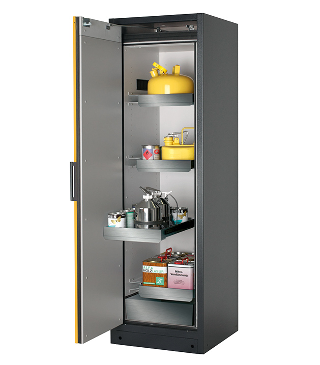 Korpusfarbe Anthrazitgrau (RAL 7016), mit Flügeltür in Sicherheitsgelb (RAL 1004), Inneneinrichtung mit 3 x Auszugswanne, 1 x Auszugswanne Entsorgung (Edelstahl 1.4301), 1 x Bodenauffangwanne (Edelstahl 1.4016)