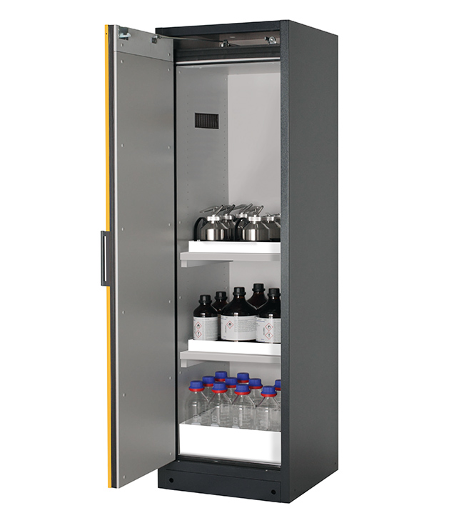 Korpusfarbe Anthrazitgrau (RAL 7016), mit Flügeltür in Sicherheitsgelb (RAL 1004), Inneneinrichtung mit 2 x Wannenboden, 1 x Bodenauffangwanne (PP)