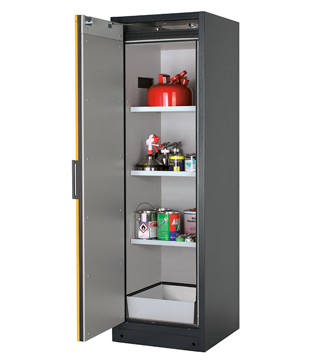 Korpusfarbe Anthrazitgrau (RAL 7016), mit Flügeltür in Sicherheitsgelb (RAL 1004), Inneneinrichtung mit 3 x Fachboden, 1 x Bodenauffangwanne (Stahlblech pulverbeschichtet)