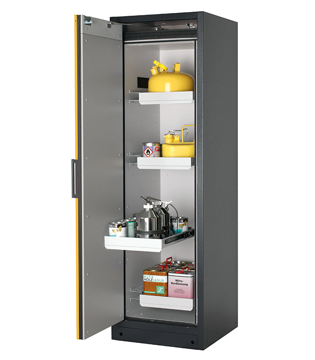 Korpusfarbe Anthrazitgrau (RAL 7016), mit Flügeltür in Sicherheitsgelb (RAL 1004), Inneneinrichtung mit 4 x Auszugswanne (Stahlblech pulverbeschichtet)