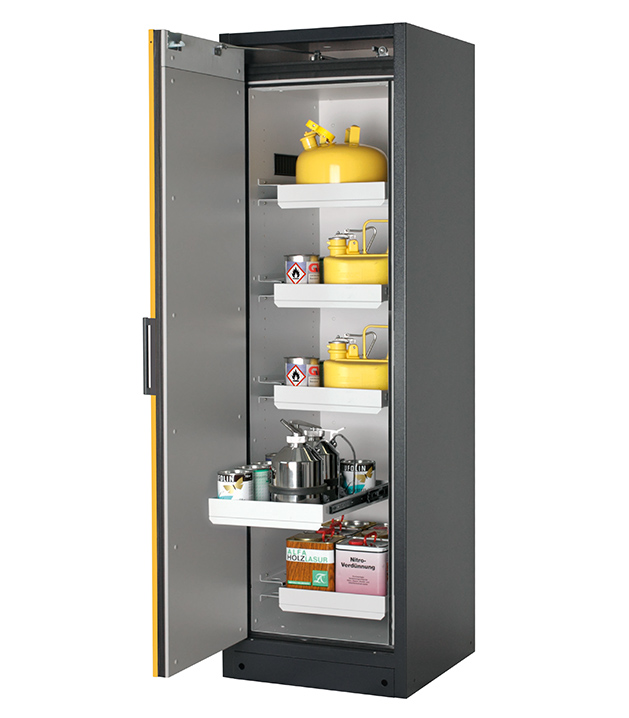 Korpusfarbe Anthrazitgrau (RAL 7016), mit Flügeltür in Sicherheitsgelb (RAL 1004), Inneneinrichtung mit 5 x Auszugswanne (Stahlblech pulverbeschichtet)