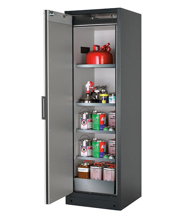Korpusfarbe Anthrazitgrau (RAL 7016), mit Flügeltür in Lichtgrau (RAL 7035), Inneneinrichtung mit 4 x Fachboden (Edelstahl 1.4301), 1 x Lochblecheinsatz, 1 x Bodenauffangwanne (Edelstahl 1.4016)