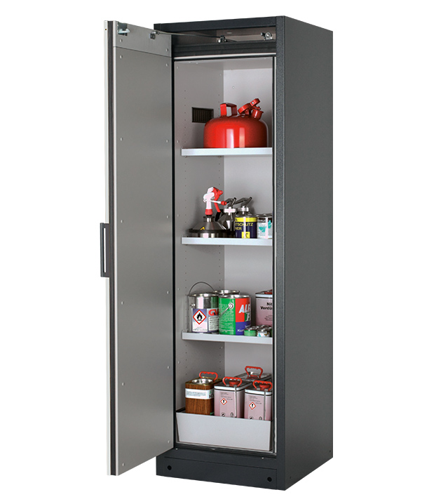 Korpusfarbe Anthrazitgrau (RAL 7016), mit Flügeltür in Lichtgrau (RAL 7035), Inneneinrichtung mit 3 x Fachboden, 1 x Lochblecheinsatz, 1 x Bodenauffangwanne (Stahlblech pulverbeschichtet)