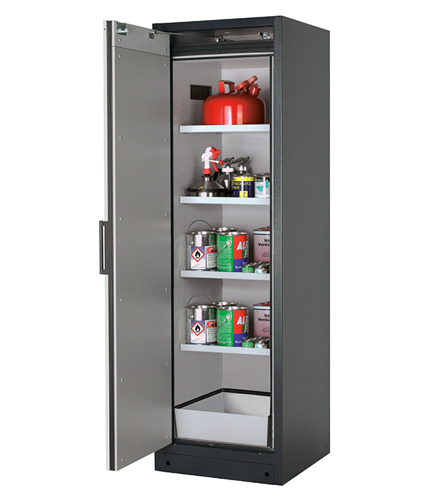 Korpusfarbe Anthrazitgrau (RAL 7016), mit Flügeltür in Lichtgrau (RAL 7035), Inneneinrichtung mit 4 x Fachboden, 1 x Bodenauffangwanne (Stahlblech pulverbeschichtet)
