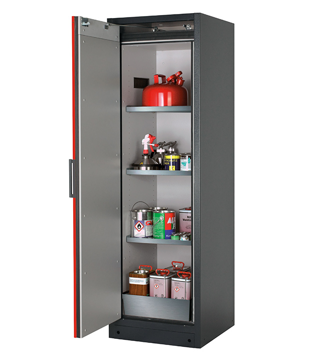 Korpusfarbe Anthrazitgrau (RAL 7016), mit Flügeltür in Verkehrsrot (RAL 3020), Inneneinrichtung mit 3 x Fachboden (Edelstahl 1.4301), 1 x Lochblecheinsatz, 1 x Bodenauffangwanne (Edelstahl 1.4016)