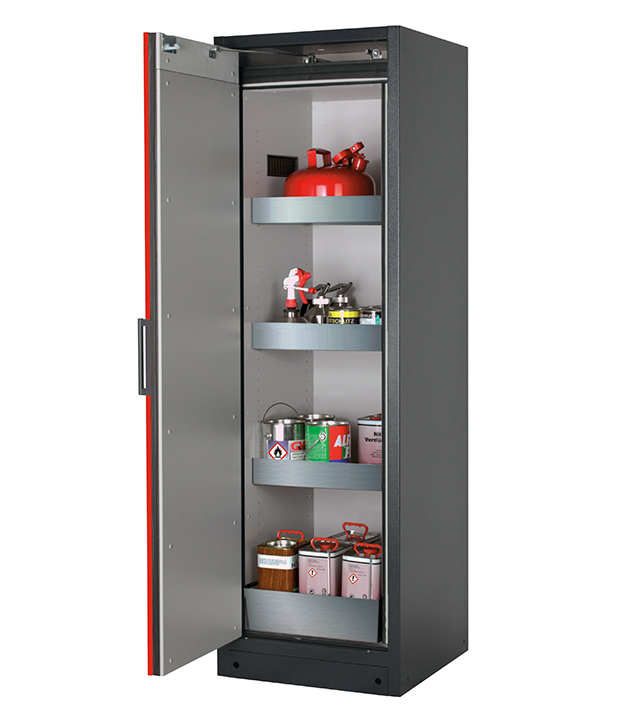 Korpusfarbe Anthrazitgrau (RAL 7016), mit Flügeltür in Verkehrsrot (RAL 3020), Inneneinrichtung mit 3 x Wannenboden (Edelstahl 1.4301), 1 x Lochblecheinsatz (Edelstahl 1.4016), 1 x Bodenauffangwanne (Edelstahl 1.4301)