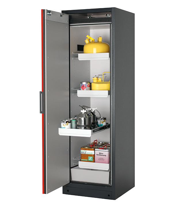Korpusfarbe Anthrazitgrau (RAL 7016), mit Flügeltür in Verkehrsrot (RAL 3020), Inneneinrichtung mit 3 x Auszugswanne, 1 x Auszugswanne Entsorgung, 1 x Bodenauffangwanne (Stahlblech pulverbeschichtet)