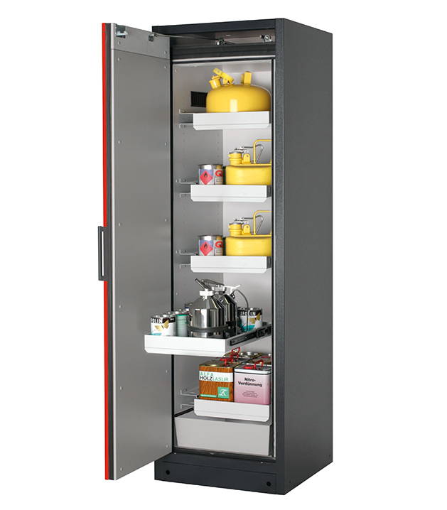 Korpusfarbe Anthrazitgrau (RAL 7016), mit Flügeltür in Verkehrsrot (RAL 3020), Inneneinrichtung mit 4 x Auszugswanne, 1 x Auszugswanne Entsorgung, 1 x Bodenauffangwanne (Stahlblech pulverbeschichtet)
