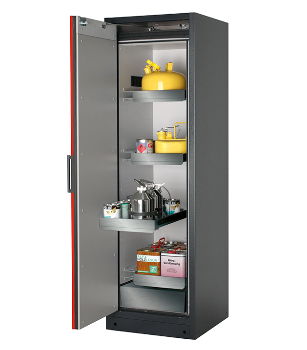 Korpusfarbe Anthrazitgrau (RAL 7016), mit Flügeltür in Verkehrsrot (RAL 3020), Inneneinrichtung mit 3 x Auszugswanne, 1 x Auszugswanne Entsorgung (Edelstahl 1.4301), 1 x Bodenauffangwanne (Edelstahl 1.4016)
