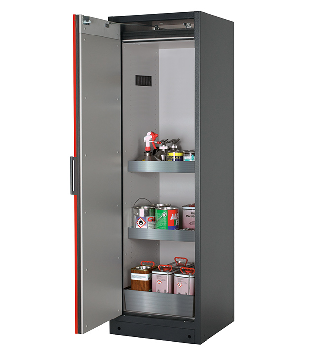Korpusfarbe Anthrazitgrau (RAL 7016), mit Flügeltür in Verkehrsrot (RAL 3020), Inneneinrichtung mit 2 x Wannenboden (Edelstahl 1.4301), 1 x Lochblecheinsatz (Edelstahl 1.4016), 1 x Bodenauffangwanne (Edelstahl 1.4301)