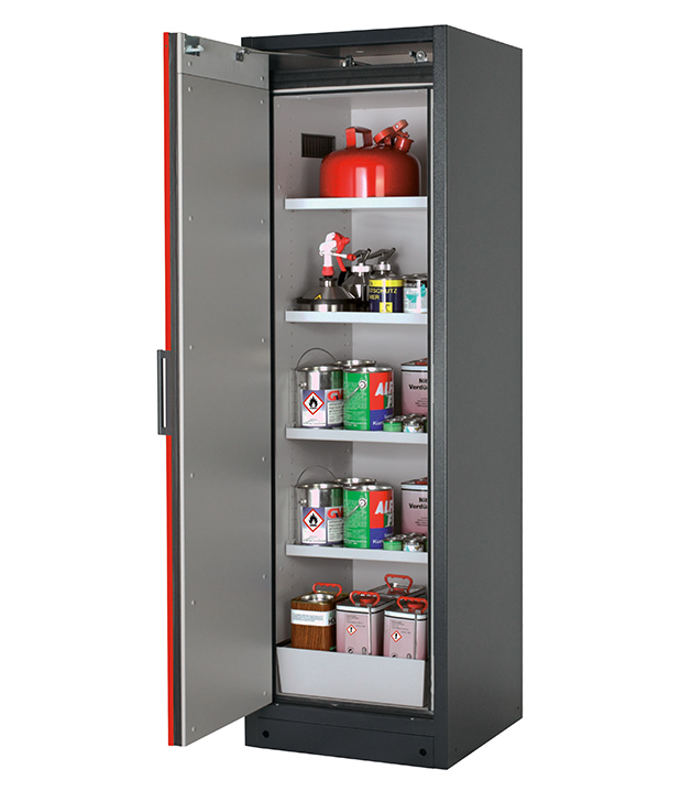 Korpusfarbe Anthrazitgrau (RAL 7016), mit Flügeltür in Verkehrsrot (RAL 3020), Inneneinrichtung mit 4 x Fachboden, 1 x Lochblecheinsatz, 1 x Bodenauffangwanne (Stahlblech pulverbeschichtet)