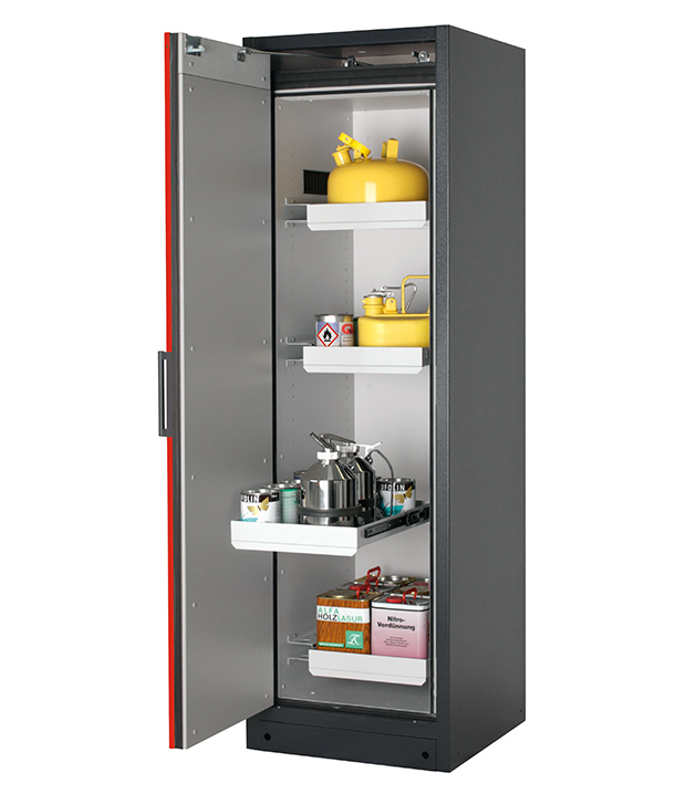 Korpusfarbe Anthrazitgrau (RAL 7016), mit Flügeltür in Verkehrsrot (RAL 3020), Inneneinrichtung mit 4 x Auszugswanne (Stahlblech pulverbeschichtet)
