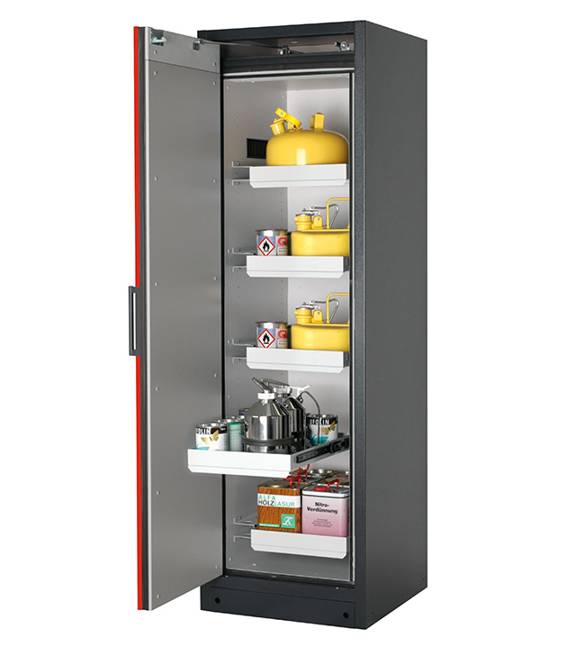 Korpusfarbe Anthrazitgrau (RAL 7016), mit Flügeltür in Verkehrsrot (RAL 3020), Inneneinrichtung mit 5 x Auszugswanne (Stahlblech pulverbeschichtet)
