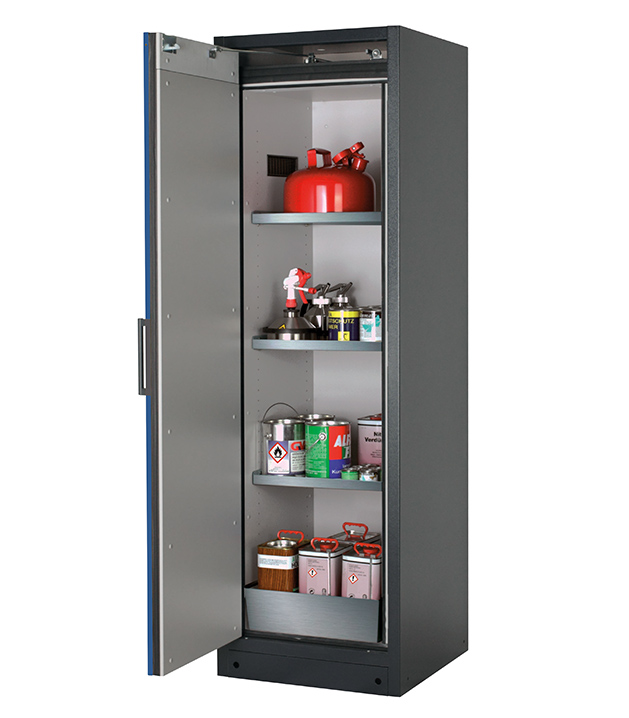 Korpusfarbe Anthrazitgrau (RAL 7016), mit Flügeltür in Enzianblau (RAL 5010), Inneneinrichtung mit 3 x Fachboden (Edelstahl 1.4301), 1 x Lochblecheinsatz, 1 x Bodenauffangwanne (Edelstahl 1.4016)