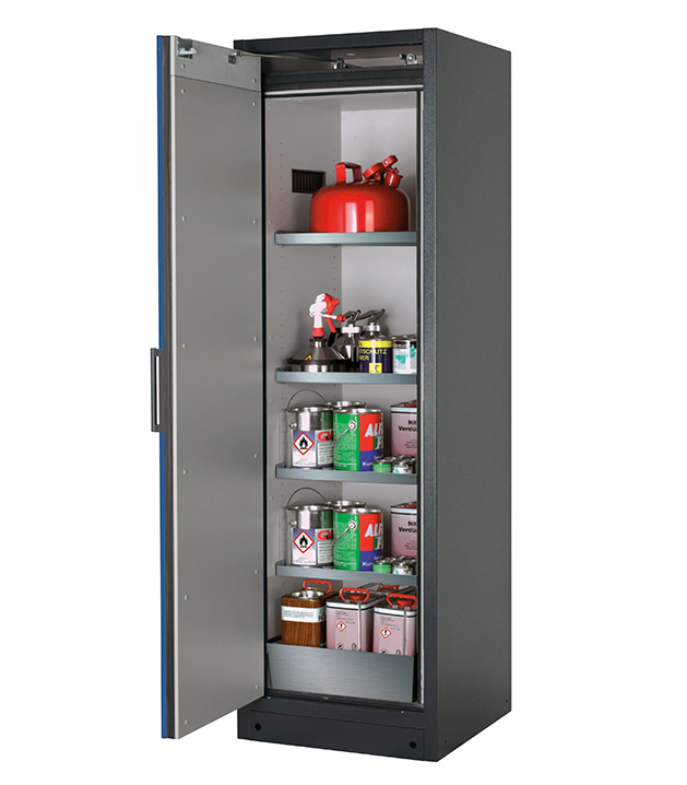 Korpusfarbe Anthrazitgrau (RAL 7016), mit Flügeltür in Enzianblau (RAL 5010), Inneneinrichtung mit 4 x Fachboden (Edelstahl 1.4301), 1 x Lochblecheinsatz, 1 x Bodenauffangwanne (Edelstahl 1.4016)