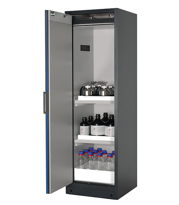 Korpusfarbe Anthrazitgrau (RAL 7016), mit Flügeltür in Enzianblau (RAL 5010), Inneneinrichtung mit 2 x Wannenboden, 1 x Bodenauffangwanne (PP)