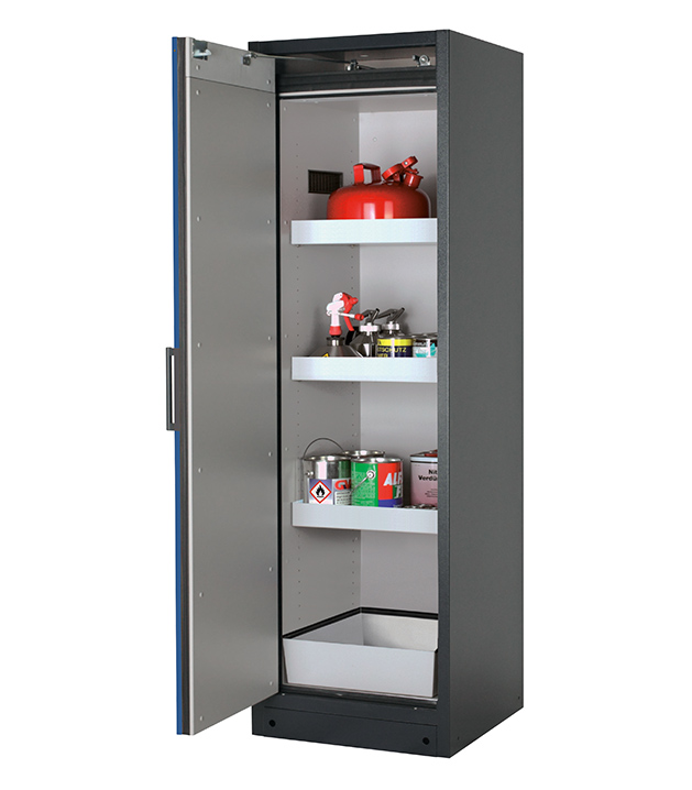 Korpusfarbe Anthrazitgrau (RAL 7016), mit Flügeltür in Enzianblau (RAL 5010), Inneneinrichtung mit 3 x Wannenboden, 1 x Bodenauffangwanne (Stahlblech pulverbeschichtet)