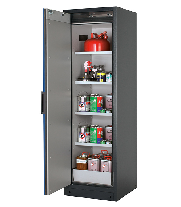 Korpusfarbe Anthrazitgrau (RAL 7016), mit Flügeltür in Enzianblau (RAL 5010), Inneneinrichtung mit 4 x Fachboden, 1 x Lochblecheinsatz, 1 x Bodenauffangwanne (Stahlblech pulverbeschichtet)